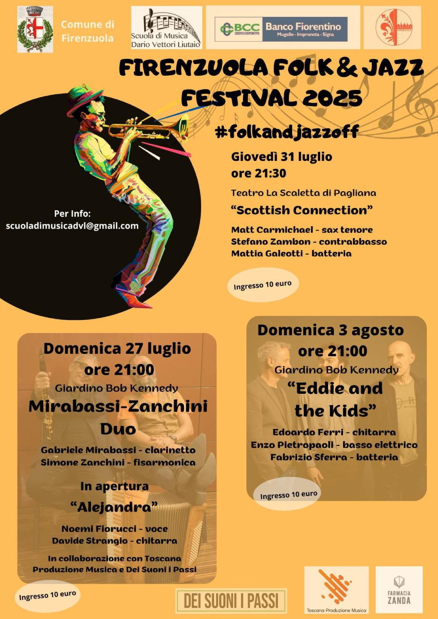 FIRENZUOLA – A venti anni dalla prima edizione del tradizionale appuntamento con la musica jazz ed etnica che inaugurò lo spazio del Giardino Bob Kennedy come luogo di elezione per un’ascolto attento, ma rilassato, tornano su questo palcoscenico artisti italiani di assoluto spessore. Con la Direzione artistica del batterista firenzuolino Mattia Galeotti, coadiuvato dal direttore e dal presidente della Scuola di Musica Dario Vettori Liutaio, Francesco Santoro e Marco Zini ed altri consulenti come la fisarmonicista Sara Calvanelli ed il bassista Pietro Zini, l’edizione 2025 apre i battenti Domenica 27 Luglio alle ore 21,00 con un doppio appuntamento. La serata sarà introdotta dal Duo “ALEJANDRA”, con Noemi Fiorucci alla voce e composizione e Davide Strangio alla chitarra (gruppo promosso da Toscana Produzioni Musica-Dei Suoni I Passi). Ascolteremo le poesie dell’argentina Alejandra Pizarnik, accompagnate da una musica evocativa e suggestiva che ci faranno immergere in un fiume di sentimenti toccando tutte le emozioni dell’animo umano nella ricerca della sua identità e del suo destino. Nella seconda parte della serata avremo l’onore di ospitare a Firenzuola due grandi musicisti della scena internazionale, il clarinettista Gabriele Mirabassi ed il fisarmonicista Simone Zanchini. Entrambi vantano collaborazioni con artisti di altissimo livello artistico ed in questa formazione sarà evidente la loro indiscussa capacità tecnica. Insieme daranno vita a sonorità inconsuete ed originali con riferimenti al jazz, alla musica sudamericana con uno scambio di improvvisazioni imprevedibili e cariche di melodia.