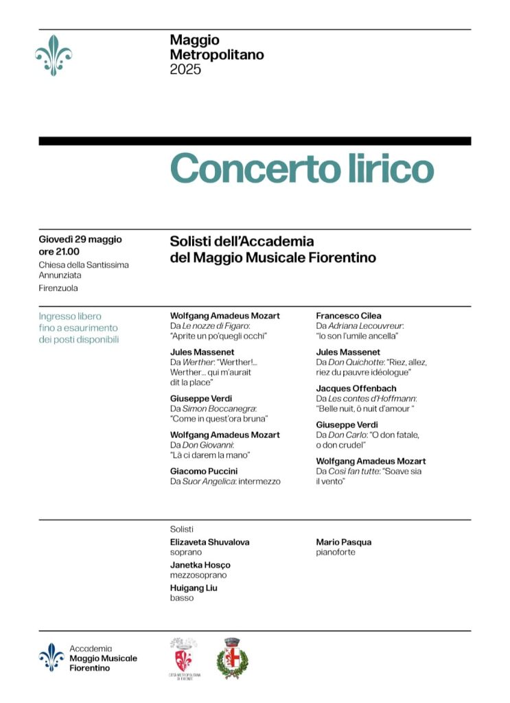 FIRENZUOLA – Il 29 maggio alle ore 21.00 i Solisti dell’Accademia del Maggio si esibiranno alla Chiesa della Santissima Annunziata di Firenzuola con l’interpretazione di alcune delle più celebri arie d’opera, con un programma che spazia da Mozart a Verdi, Rossini, Massenet l, Offfenbach e Cilea.