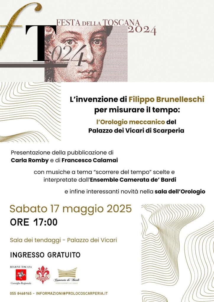 SCARPERIA E SAN PIERO – Sabato 17 maggio, alle ore 17.00, nell’ambito del calendario di eventi della Festa della Toscana 2024 organizzati dalla Proloco di Scarperia, l’Orchestra Camerata de’ Bardi si esibirà nella Sala dei tendaggi di Palazzo dei Vicari, per la serata titolata “L’invenzione di Filippo Brunelleschi per misurare il tempo: l’Orologio meccanico del Palazzo dei Vicari di Scarperia”.