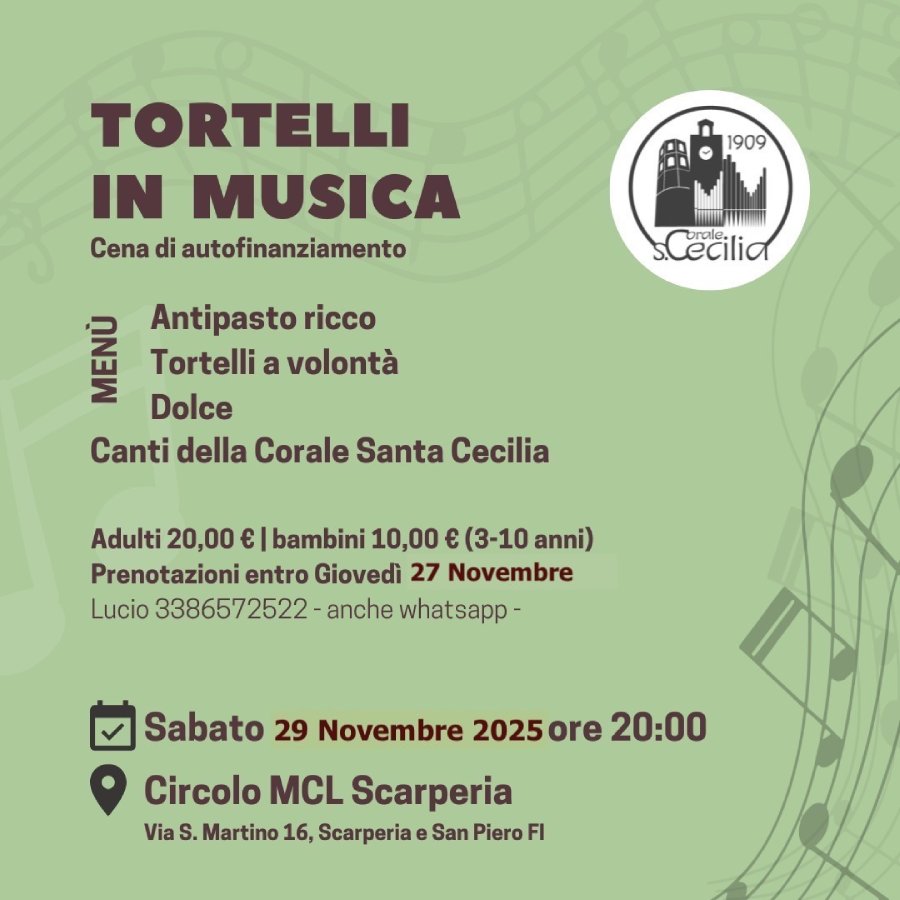 BORGO SAN LORENZO – Sabato 29 Novembre alle 20.00 al circolo Mcl di Scarperia si terrà “Tortelli in musica”: la cena di autofinanziamento della “Corale Santa Cecilia” di Borgo San Lorenzo. Un’occasione per stare insieme all’insegna del buon cibo, ma anche una serata per supportare i tanti progetti futuri di una delle associazioni più antiche e vitali del Mugello:  la nostra Corale Santa Cecilia 1909 di Borgo San Lorenzo. Attenzione, chi vuole partecipare dovrà prenotare entro giovedì 27 Novembre.